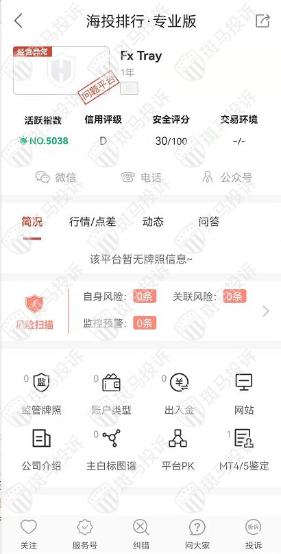 这家平台叫Fx Tray,成立于2021年,全球排名5038名,目前无监管,没有外汇牌照,不能做外汇保证金交易,风险扫描显示0条风险,投资者资金安全无保障。