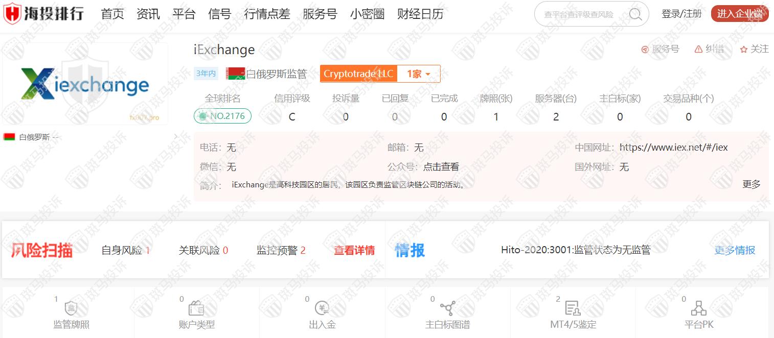 这家平台叫iExchange,成立于2019年,全球排名2176名,目前无监管,没有外汇牌照,不能做外汇保证金交易,风险扫描显示2条风险,投资者资金安全无保障。