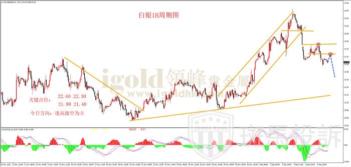 从图中白银1小时周期图看,白银在上涨通道末端做了一个高位头肩顶形态,行情跌破头部颈线位后形成了下跌趋势,从k线力度看,空头下跌动能强势,行情继续延续下行趋势不变。价格昨日超跌企稳后形成短线超跌反弹行情,高点承压在22.60附近开始下跌,目前行情跌破了前期小支撑点22.16,创了日内新低,空头继续延续下跌走势概率较大。结合MACD指标来看,快慢线高位死叉进入0轴下方,表明空头力量主导行情,目前快慢线0轴下方出现死叉信号,表示空头开启新一轮下跌走势。策略上投资者顺势反弹压力位做空位主。