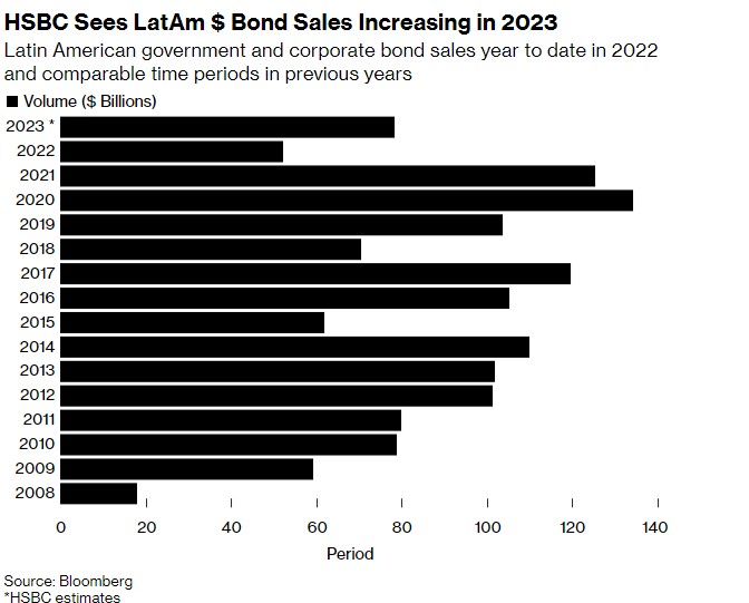 来自汇丰(HSBC Holdings Plc)的一些银行家近日表示,随着美联储明年有可能暂停加息,甚至放松货币紧缩政策,拉丁美洲美元债券的发行数额明年将从14年来的最低水平跃升约50%。美联储为对抗40年来最高通胀而采取的激进货币政策,使得一些债券难以在2022年成功发行并出售。随着美联储基准利率在2023年接近峰值,一些借款方也许能够安心出售更多债券,从而推动经济反弹。