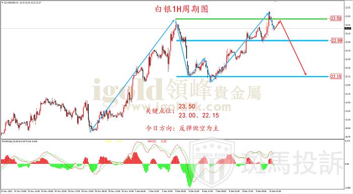 从1H周期走势结构看,白银自20.85附近上涨,在涨至23.50附近后受阻,随后价格大跌,上周五白银在经过连续的上涨后,突破23.50附近高点压力,但未能延续上涨,目前再次回到23.50之下,形态上有假破的可能,操作上可在前期高点附近尝试布局空单。结合MACD指标来看,白银价格创出新高,但DIFF线与DEA线并未创出新高,表明多头力量不足,日内可在23.50附近尝试空单。