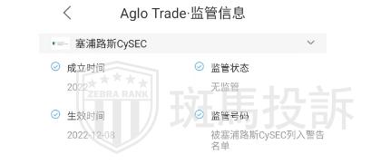 Aglo Trade平台自称受到塞浦路斯证券交易委员会(许可证号:90158)、国际金融服务委员会(IFSC)(28/437/FD/22)和毛里求斯共和国金融服务委品会(投资交易商执照号码:D2057O0963)的监管,但是据查询并没有相关信息,还发现Aglo Trade平台被塞浦路斯CySEC列入警告名单,也就是说Aglo Trade平台目前没有有效的金融监管,投资风险极大,投资需谨慎。