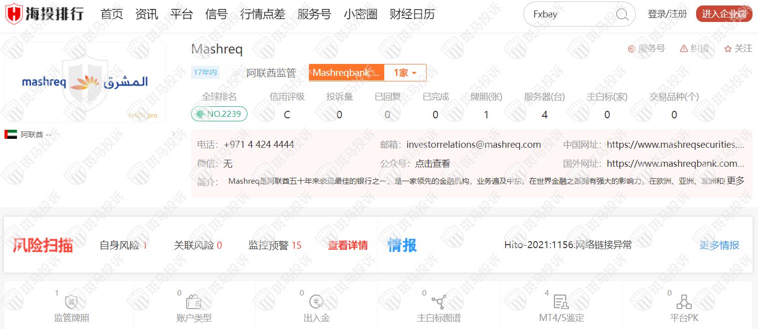 这家平台叫Mashreq,成立于2019年,全球排名2235名,目前无监管,没有外汇牌照,不能做外汇保证金交易,风险扫描显示15条风险,投资者资金安全无保障。