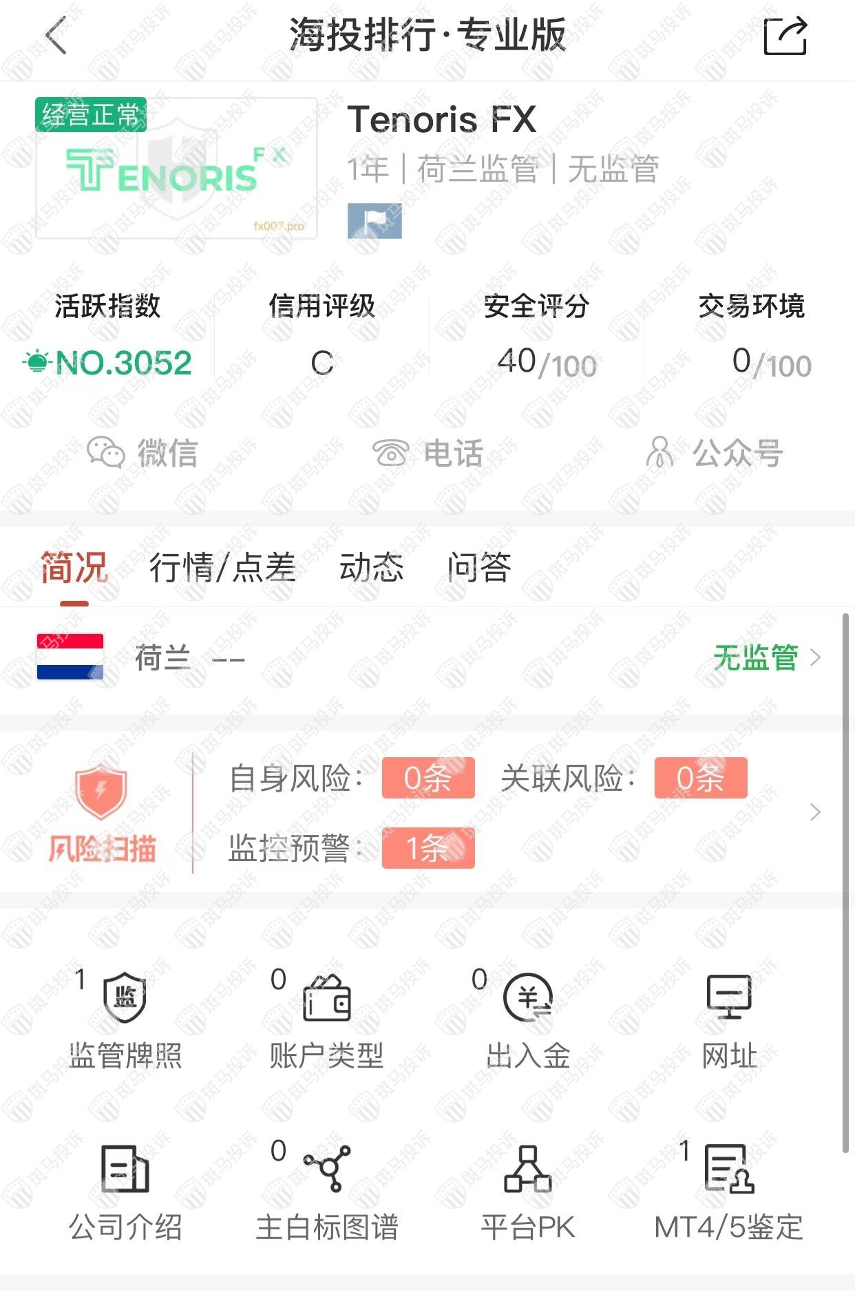 这家平台叫Tenoris FX,成立于2021年,全球排名3052名,目前无监管,但是没有外汇牌照,不能做外汇保证金交易,风险扫描显示1条风险,投资者资金安全无保障。