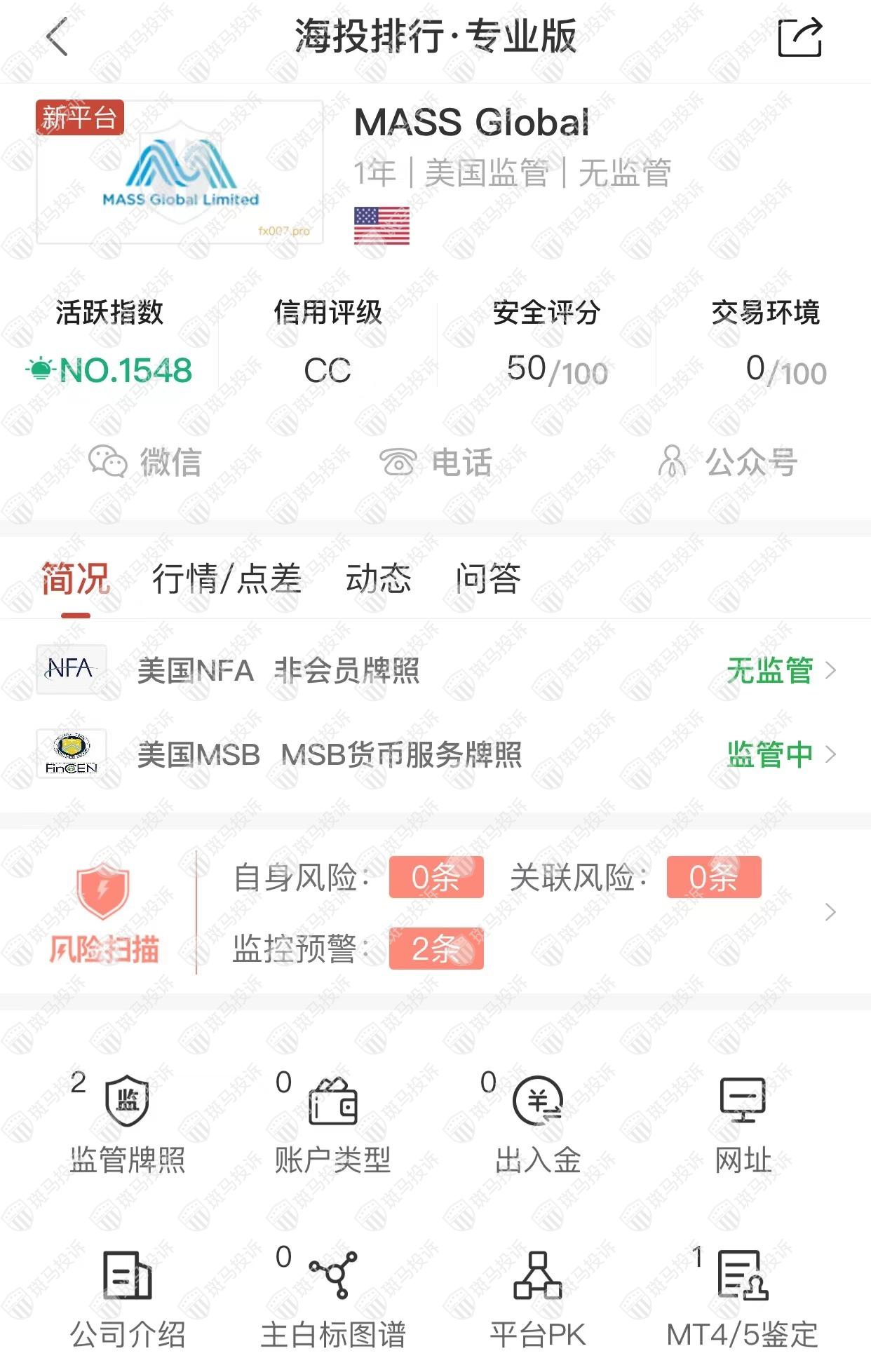 这家平台叫MASS Global,成立于2021年,全球排名1548名,目前无监管,但是美国MSB外汇牌照,能做外汇保证金交易,风险扫描显示2条风险,投资者资金安全有保障。