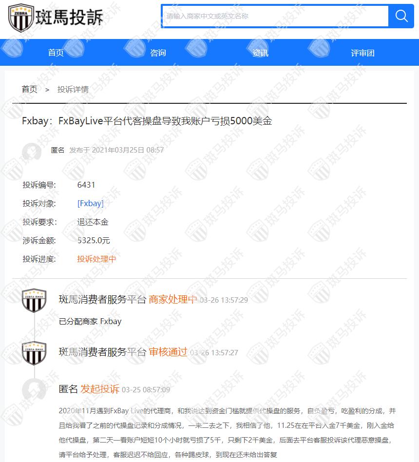 Fxbay平台目前在斑马投诉有1条投诉,仍在处理中。