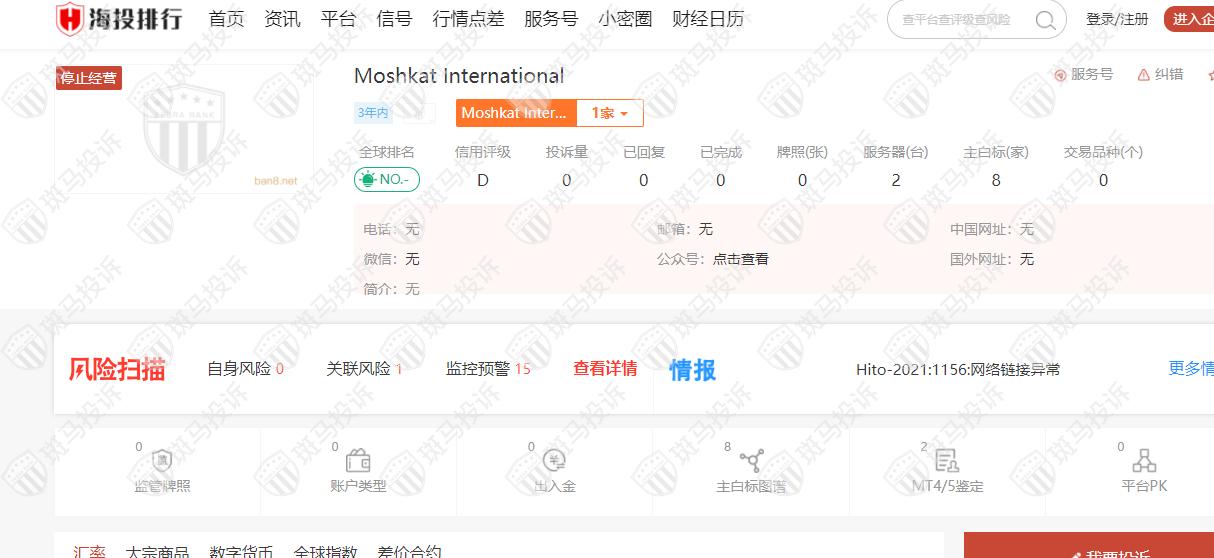 这家平台叫Moshkat International,成立于2019年,全球排名未显示,目前无监管,没有外汇牌照,不能做外汇保证金交易,风险扫描显示16条风险,投资者资金安全无保障。
