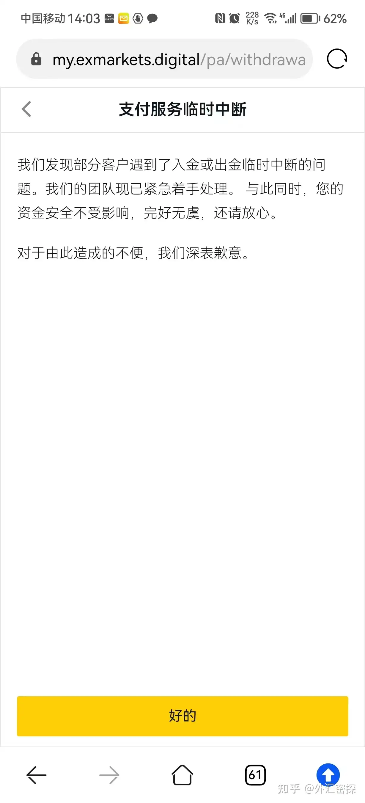 根据用户提供的消息,EXness支付通道由于和第三方没有谈拢,目前中断提现,何时回复,仍在等待官方的回答。外汇密探已第一时间联系平台负责人,截止目前,还未收到回复。我们将在第一时间更新此信息。大家先不要着急,耐心等待。