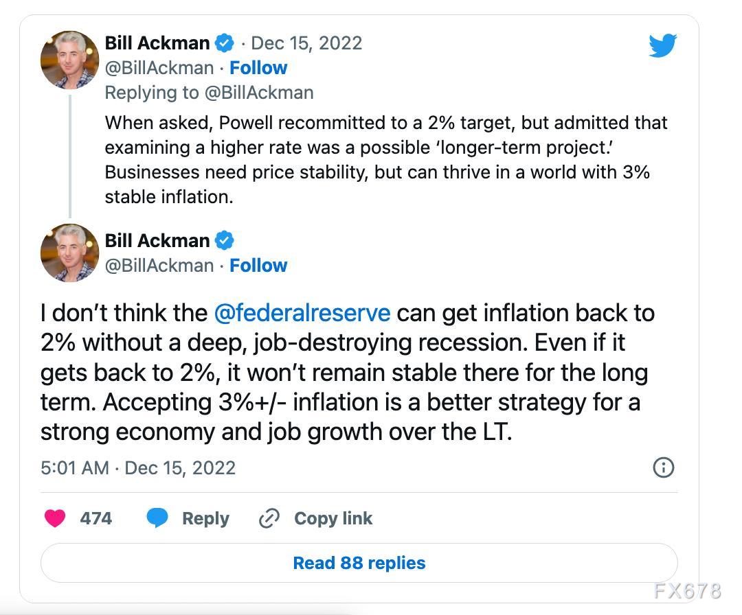 今年早些时候,阿克曼支持美联储采取激进行动,并呼吁7月加息整整100个基点。他的公司通过押注利率上升获利颇丰,今年赚了近20亿美元,自2020年新冠疫情爆发以来赚了52亿美元。