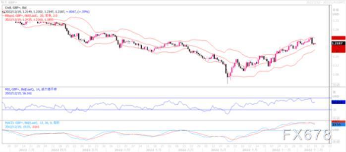 上周五(12月16日),英镑兑美元延续下跌的走势,全日继续微跌0.38%,低收在1.2140。英镑的下跌源于上周四英国央行利率决议的鸽派结果,两名货币政策委员会委员投票维持利率不变,削弱了英镑,同时英国令人失望的宏观数据进一步给英镑带来了压力。英国国家统计局报告称,11月份国内零售销售月率下降了0.4%,同比下降5.9%。此外,不包括波动较大的汽车和燃料在内的销售额在报告的月份下降了0.3%,低于普遍预期。这些数据加剧了人们对于英国经济已进入长期衰退的担忧。然而,交易员们也在等待本周美国12月采购经理人指数数据结果,若呈现下跌,或有利于英镑的回升。此外,美国国债收益率和更广泛的风险情绪将会继续影响美元的价格变动,英镑或也能从中寻觅到交易的机会。目前日线图上,英镑兑美元险险守在20均线附近,目前下方1.21附近的支撑较为关键,若跌破英镑的上升通道将遭到破坏。相反若能撑住,后市继续攀高仍可期待。