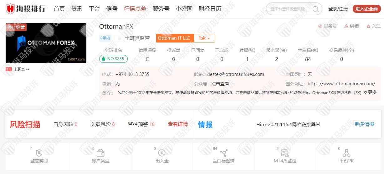 这家平台叫OttomanFX,成立于2020年,全球排名3835名,目前无监管,但是没有外汇牌照,不能做外汇保证金交易,风险扫描显示24条风险,投资者资金安全无保障。