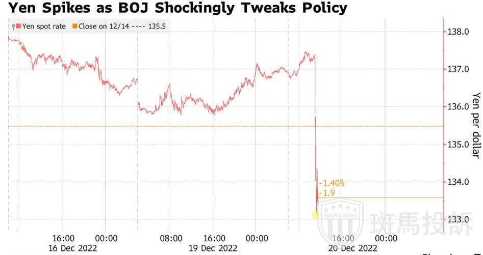日本央行出人意料地修改了其收益率曲线控制(YCC)政策,这给市场带来了冲击,表明最后一个坚守在极低利率水平的发达国家也正在逐步走向政策正常化。此前,日本央行意外表示将允许10年期国债收益率上限从此前的0.25%上升至0.5%。随后,日元兑美元汇率上升近3%,Bloomberg美元现货指数下跌0.7%;而10年期日本国债收益率飙升20.5个基点至2015年以来的最高水平。此举还引发日本国债市场与股市大跌。美债大跌,10年期美债收益率一度短线上行至3.62%;三大美股指数期货也跳水。