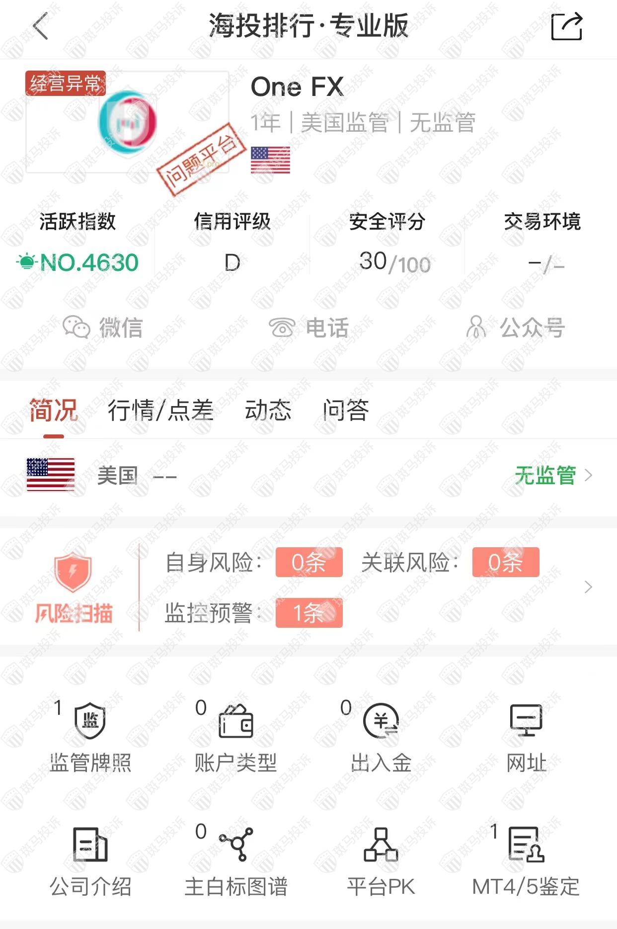这家平台叫One FX Trade,成立于2021年,全球排名4629名,目前无监管,但是没有外汇牌照,不能做外汇保证金交易,风险扫描显示1条风险,投资者资金安全无保障。