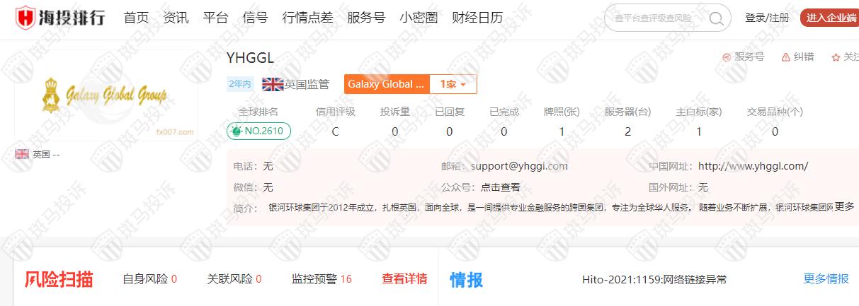 这家平台叫YHGGL,成立于2020年,全球排名2610名,目前无监管,没有外汇牌照,不能做外汇保证金交易,风险扫描显示17条风险,投资者资金安全无保障。