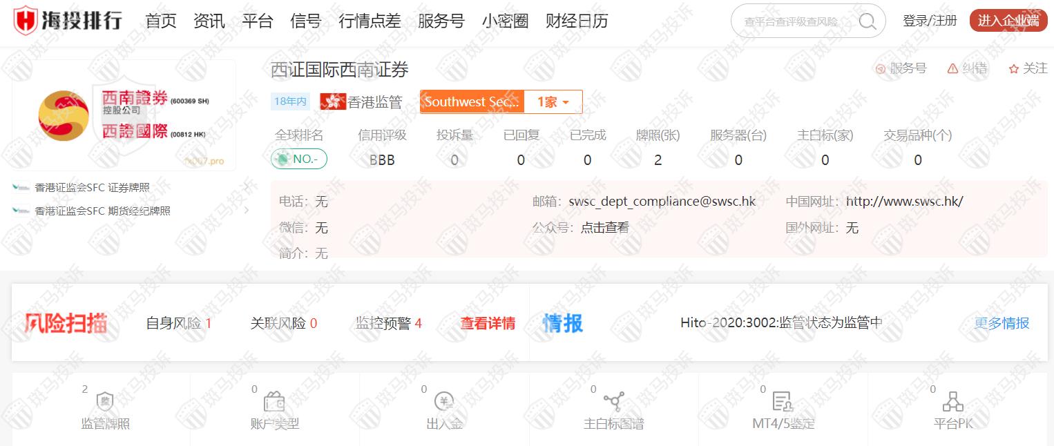 西证国际成立于2004年,目前受香港证监会SFC监管,风险扫描显示4条风险,投资者投资交易需谨慎。