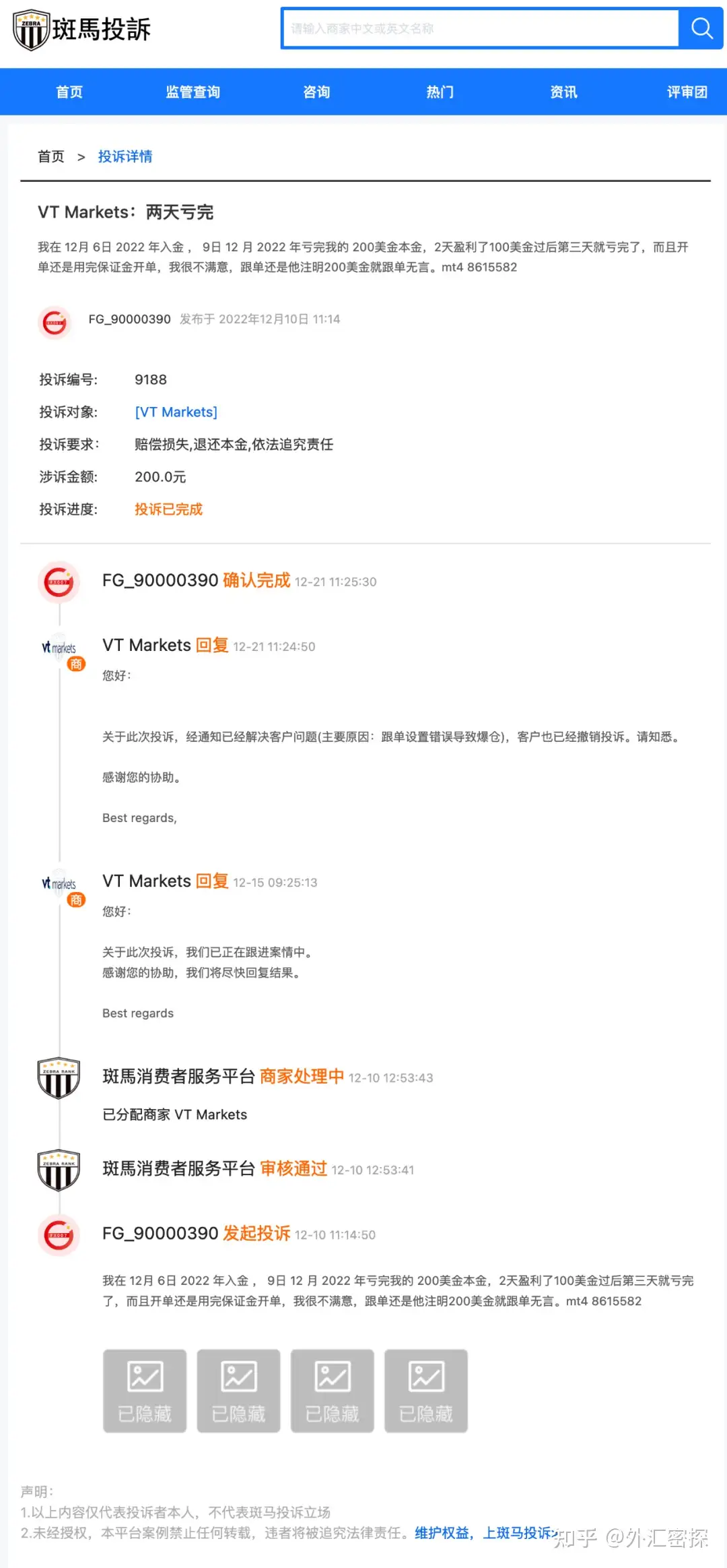 有用户投诉:在VT Markets开户(mt4 8615582)两天就亏完,2022年12月6日入金 , 12月9日亏完我的200美金本金,2天盈利了100美金过后第三天就亏完了,而且开单还是用完保证金开单,我很不满意,跟单还是他注明200美金就跟单无言。