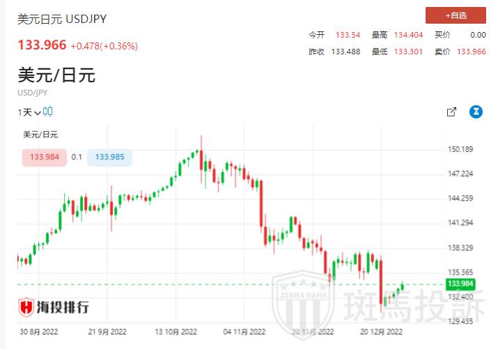 周三,美元兑日元(133.93,0.4300,0.32%)汇率攀升至一周多高点,截至发稿,美元兑日元汇率涨0.28%,报133.86;该汇率日内早些时候触及134.40,为12月20日以来首次。