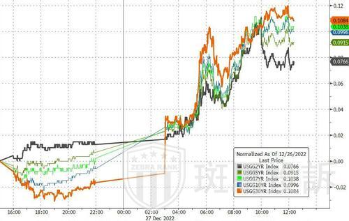 行情数据显示,各期限美债收益率周二在结束圣诞小长假后便一路高开高走。截止纽约时段尾盘,2年期美债收益率上涨4.9个基点报4.383%,5年期美债收益率上涨8.2个基点报3.945%,10年期美债收益率上涨9.3个基点报3.845%,30年期美债收益率上涨10.4个基点报3.931%。