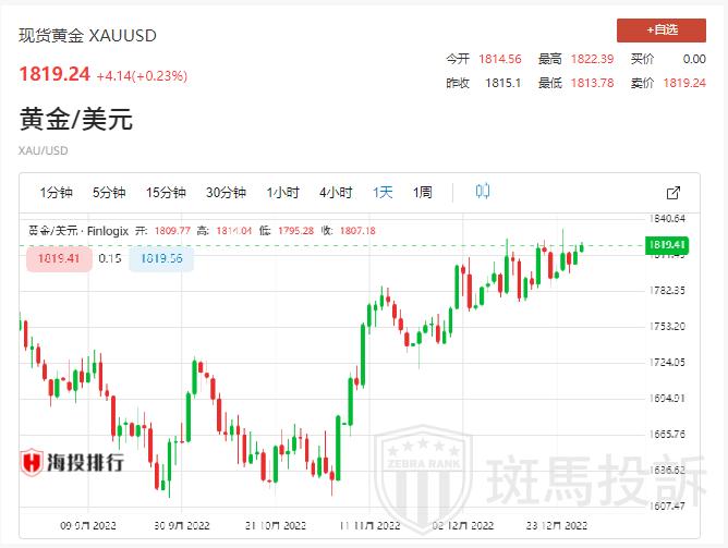 周五(12月30日),国际金价走强,因利率上升迫使企业放慢招聘进程,市场寄希望于美联储可能放缓加息步伐。美国新的经济刺激措施可能导致未来美元下跌。北京时间15:04,现货黄金上涨0.40%至1822.04美元/盎司;COMEX期金主力合约上涨0.16%至1828.9美元/盎司;美元指数(104.0925,0.1132,0.11%)上浮0.04%至104.024。