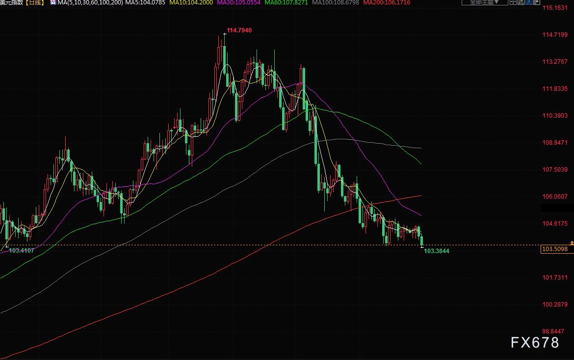 美元兑一篮子货币的年度涨幅势将达到7.9%,为七年来最大。但最近几周,随着投资者寻找美联储加息周期可能结束的迹象,美元已经缩减了涨幅。自3月以来,美联储已累计加息425个基点,以试图遏制不断上升的通胀。美元指数周五下跌约0.433%,报103.530,流动性因假期而降低。