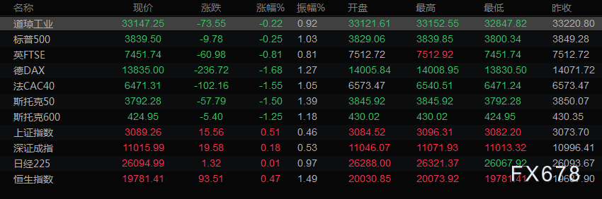 美股收盘情况:道琼斯指数收盘下跌0.22%,报33147.25点;标普500指数收盘下跌10.78点,跌幅0.28%,报3838.50点;纳斯达克综合指数收盘下跌0.11%,报10466.48点。