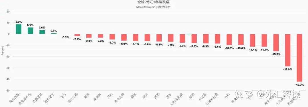 2022年是外汇市场的“超级大年”,美联储大幅加息助推美元指数创20年新高,以欧元、英镑、日元为代表的非美货币大幅贬值。2022年,美元指数上涨8.6%,欧元兑美元下跌约6.4%。