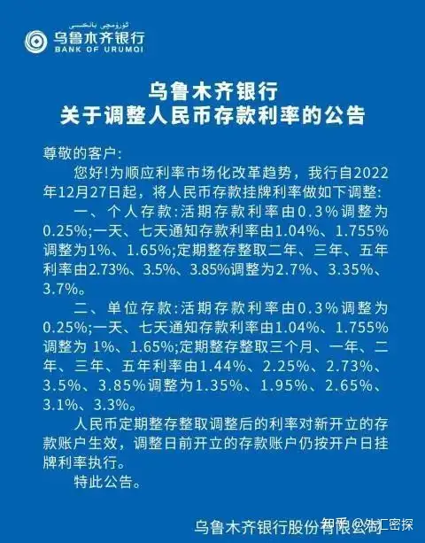 乌鲁木齐银行发布公告称,为顺应利率市场化改革趋势,该行将对人民币存款挂牌利率进行调整。个人存款方面,活期存款利率由0.3%调整为0.25%;一天、七天通知存款利率由1.04%、1.755%调整为1%、1.65%;定期整存整取二年、三年、五年利率由2.73%、3.5%、3.85%调整为2.7%、3.35%、3.7%。
