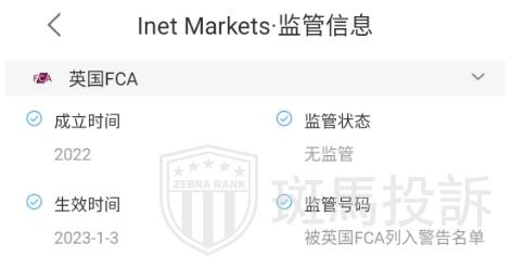 据查询,Inet Markets平台被英国FCA列入警告名单,该平台在未取得英国FCA许可和授权的情况下就展开金融活动,用户在这里投资如果出现问题的话会很难找回资金和得到保障,所以投资该平台需谨慎!