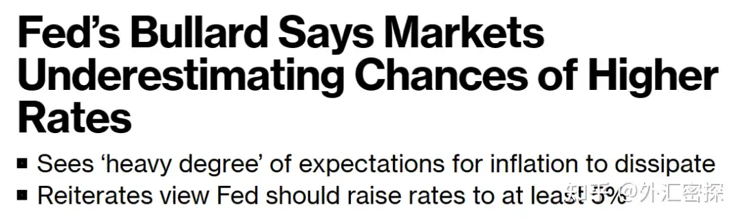 由于布拉德比较“单刀直入”的风格,华尔街媒体也是对他的观点比较青睐,因为有足够的话题性。在2022年11月时,布拉德(当时还作为票委,2023年他不再具有投票权)的一份材料中显示,他认为联储本轮终端利率的底线在5%,区间在5%-7%。这一言论当天就让很多媒体不困了。图:某媒体——布拉德表态市场低估了更高利率的可能,联储至少应该加息至5%。
