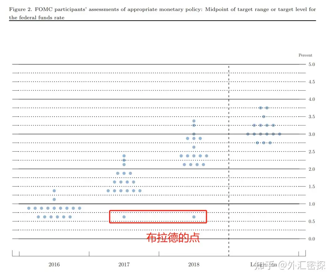 在所有美联储的官员中,我最喜欢的一位是布拉德。布拉德的政策立场总是非常极端且容易反复横跳,可以说是FOMC内的大“滑头”了。在上一轮联储加息周期中,他的两件轶事让笔者印象比较深刻。一件是在2015年底联储首次加息时,他突然从一位鹰派变为了一位超级大鸽派,本来认为应该快速加息的他开始支持“永久零利率”,并且此后在2016年中时直接成为了点阵图中孤独的“一点”,要知道,他在当年可是有投票权的,华尔街媒体戏称布拉德“老鹰想试试鸽子的白羽”;而另一件则是他作为FOMC委员,曾经在一次公开演讲中调侃FOMC的预测能力,称FOMC在预测经济、就业和通胀的准确性上可谓“失败帽子戏法”,这一表态发生于联储首次加息以前的十天内(2015年12月)。图:布拉德在2016年时的利率预测,认为联储在加息1次(25bp)以后就该停下。现实情况是联储在2017年时加速加息。