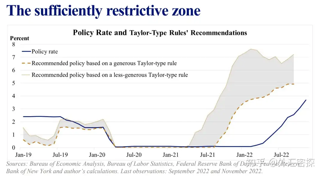 当时许多媒体的报道倾向是强化5%作为终端利率的底线,并且放大7%——作为潜在的政策利率天花板。因为对于市场而言,7%是一个不可接受的数字。布拉德在当时的PPT中所表露的也确实是强硬鹰派的态度。图:PPT中表示当前的利率水平(2022年12月加息前)还没有达到限制性的区间(5%-7%)。