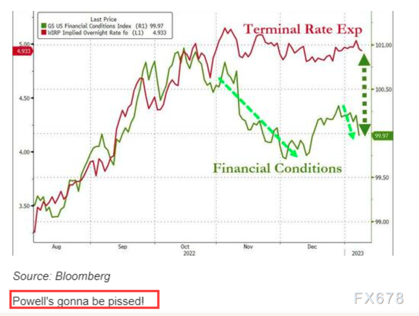 对此,知名财经博客网站Zerohedge就认为,面对着当前再度变得宽松的市场环境,美联储主席鲍威尔今晚可能会“生气”。从近来的走势看,尽管上周的美联储会议纪要特别警告市场,不要“毫无根据地”放松金融状况,但市场金融状况反而出现了进一步的放松。这一差异可能令鲍威尔在今晚继续咬定鹰派不放松……