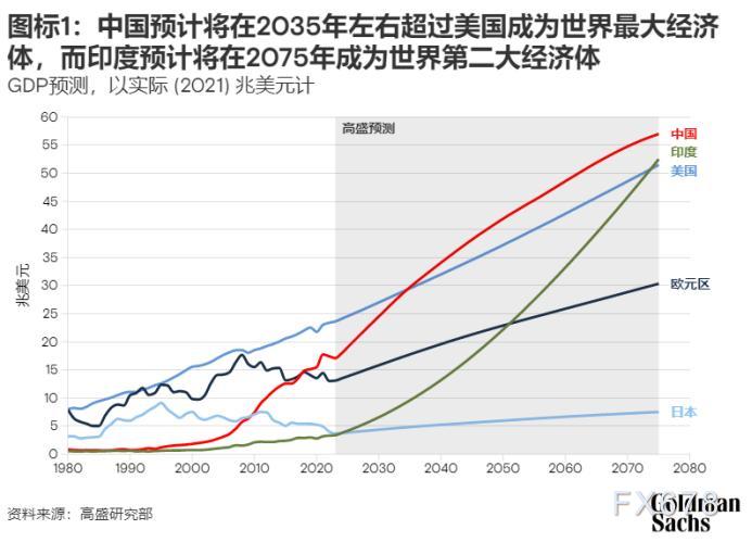 高盛研究部认为,全世界经济增长最快的时期已经一去不复返。随着人口增长减弱,经济扩张也逐渐放缓。部分亚洲新兴经济体预计将继续追赶并超越发达国家,未来30年全球GDP的重心将更多地向亚洲转移。其中,最大的变化包括中国或将在2035年超越美国,成为世界第一大经济体;印度也可能将在2075年继续超越美国,跃居世界第二。