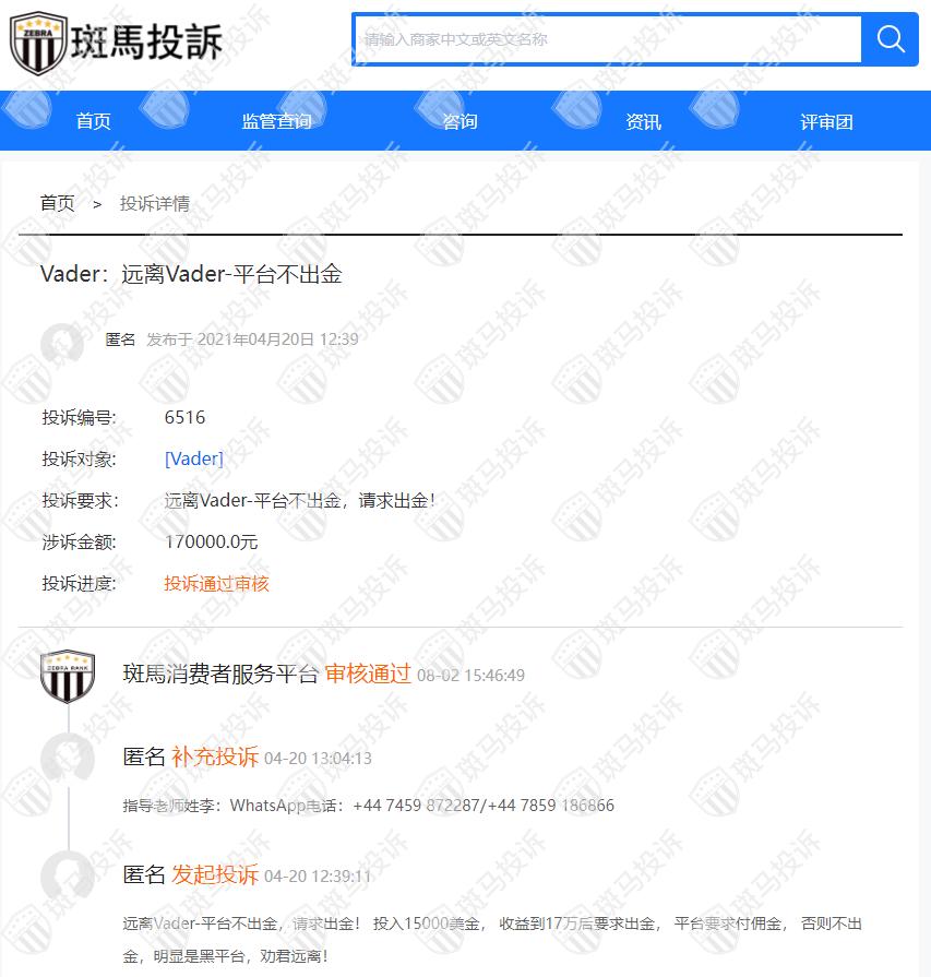 据投诉者反馈,Vader平台不出金,请求出金!该用户在Vader投入15000美金,收益到17万后要求出金,Vader却要求付佣金,否则不出金,这明显是黑平台,劝君远离!该用户的指导老师姓李,WhatsApp电话:+44 7459 872287/+44 7859 186866。
