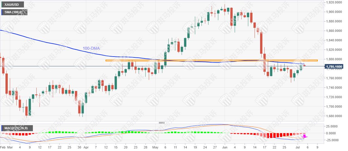 金价自4月中旬低点的反弹受阻于100日均线1790美元,更上方阻力位于六周水平区域,位于1,798–99美元附近。