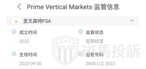 Prime Vertical Markets平台是一家在圣文森特和格林纳丁斯注册成立的公司,有限责任公司编号2605 LLC 2022,注册地址为金斯敦詹姆斯街第一圣文森特银行大厦一楼。受圣文森特FSA监管,属于超限经营的范畴,拥有金融服务牌照。