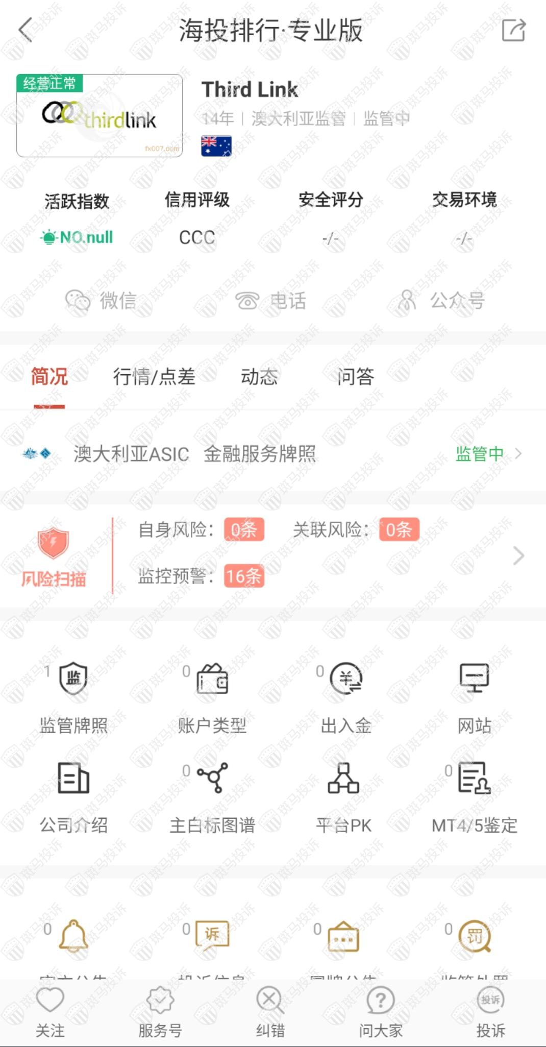 这家平台叫Third Link,成立于2008年,全球无排名,目前有澳大利亚ASIC监管,有外汇牌照,能做外汇保证金交易,风险扫描显示16条风险,投资者资金安全有保障。