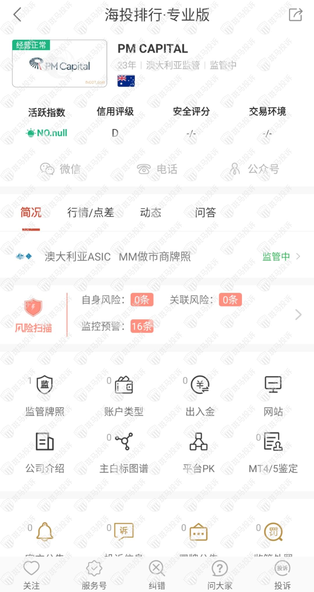 这家平台叫PM CAPITAL,成立于1998年,全球无排名,目前有澳大利亚ASIC监管,有外汇牌照,能做外汇保证金交易,风险扫描显示16条风险,投资者资金安全有保障。