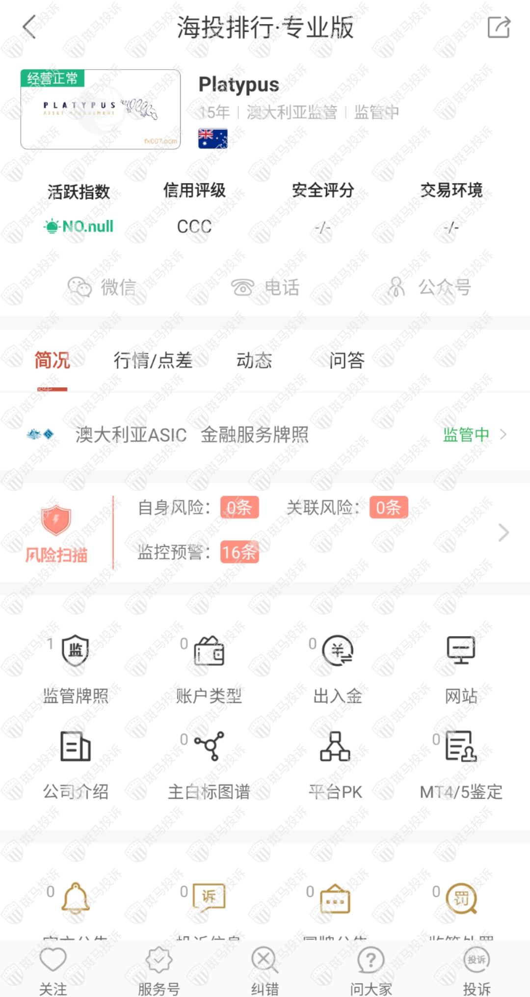 这家平台叫Platypus,成立于2006年,全球无排名,目前有澳大利亚ASIC监管,有外汇牌照,能做外汇保证金交易,风险扫描显示16条风险,投资者资金安全有保障。