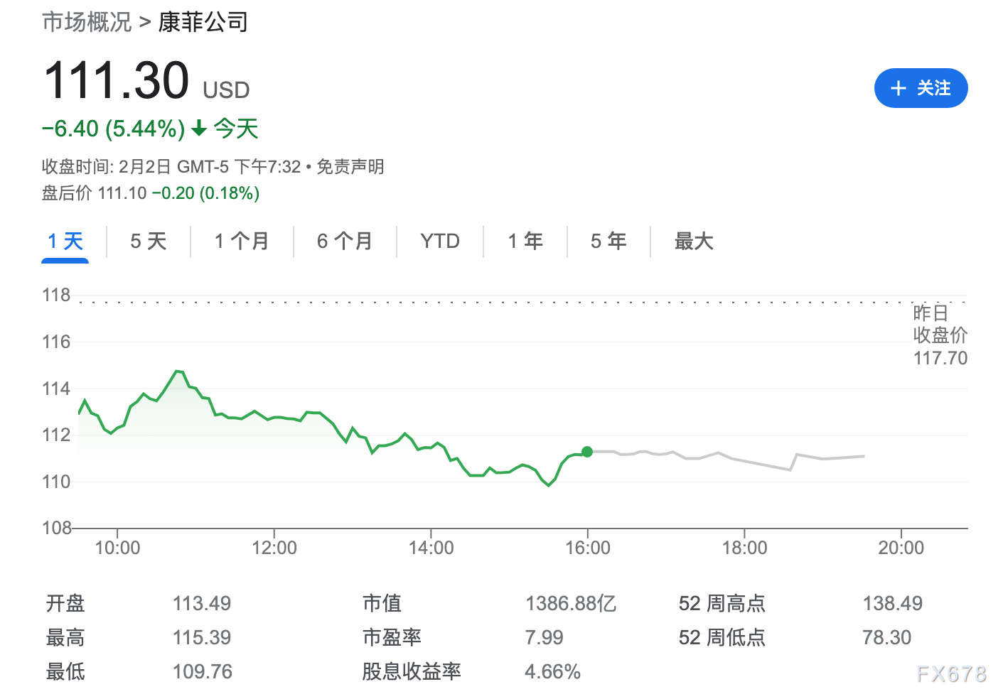 不过,受当日油价下跌以及第四季度利润不及预期影响,康菲石油股价周四下跌逾5%,收报111.3美元。