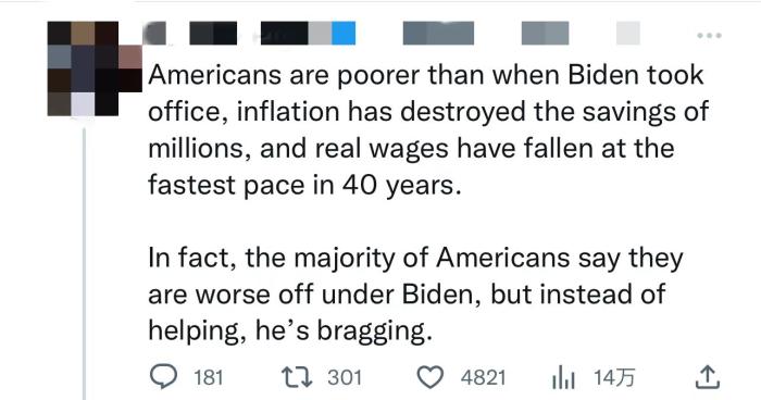 拜登的言论也招致网友的不满,有人指出,“美国人比拜登上任时更穷,通货膨胀摧毁了数百万人的积蓄,实际工资以40年来最快的速度下降。事实上,大多数美国人说他们在拜登的领导下过得更糟,但拜登没有提供帮助,而是在吹牛。”