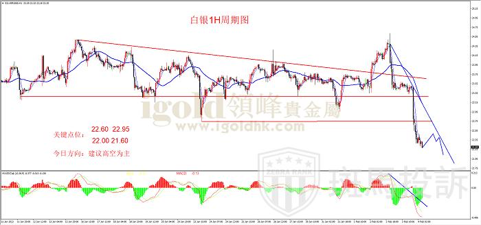白银从1小时级别看,价格高位持续处于宽幅震荡格局中,高位构建了宽幅震荡收敛三角形形态,形态下边重要支撑位置在23.20附近,当价格有效跌穿支撑后,震荡趋势转变为下跌趋势,日内支撑点变成反弹重要压力点。目前行情处于空头趋势的震荡下行走势当中不变,由于日线级别连续2日大幅度超跌,短期行情超跌后修复做宽幅震荡整理形态概率较大。日内关注上方重要阻力位22.50和22.75附近,反弹在此区间受阻后,建议继续尝试博取空单。