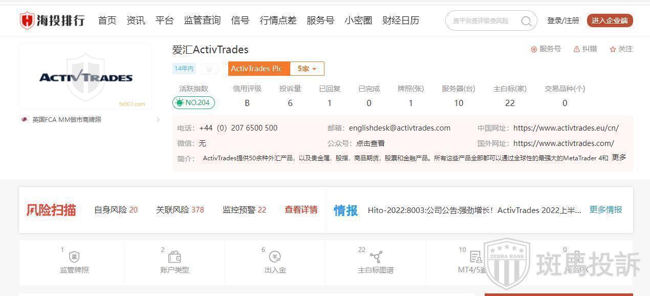 爱汇ActivTrades成立于2001年,安全评分70分,风险扫描显示420条风险,投资者资金安全无保障。