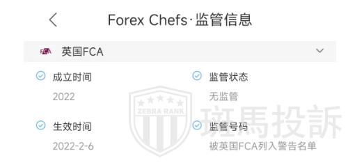 Forex Chefs平台被英国FCA列入警告名单,FCA/PRA不监管这家公司,金融监察员服务将无法解决与该公司的纠纷,金融服务补偿计划将无法解决针对该公司的索赔。用户投资这家平台一旦出现问题,您将获得较少的保护。投资风险极大,需注意做好规避。