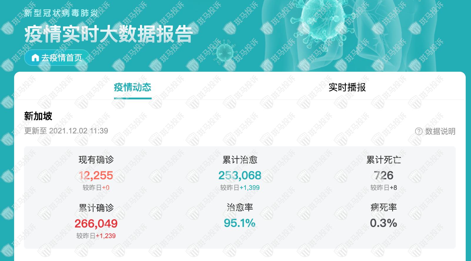 新加坡新冠疫情最新消息:截至2021年12月02日11时,新加坡昨日新增1239例确诊,新增治愈1399例,新增死亡8例,现有确诊12255例,病死率0.3%。
