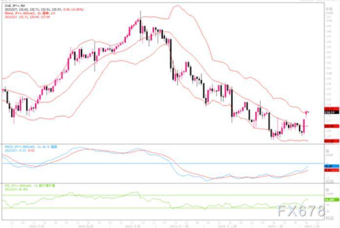 周一(2月6日)美元兑日元继续大幅上挺1.11%,盘中最高触及132.90,收盘于132.63。稍早《日经新闻》援引不具名政府和执政党消息人士报导,日本政府已经就央行副总裁雨宫正佳接替黑田东彦担任央行总裁一事征求了意见。雨宫正佳一直被认为是央行总裁职位竞争者中最鸽派的,这打击了日本央行政策正常化将在新总裁领导下取得进展的希望。叠加近期美国强劲非农数据所带来的冲击,日元近日走软较为剧烈。4小时图上美元兑日元出现超买迹象,或会出现短线小幅调整机会。但日线图上,则显示出较强的美元买盘迹象,上方关注133.35附近的阻力,若破位则可能威胁135前期较为密集交易的水平。当前,下方重新试低的概率似乎不大。