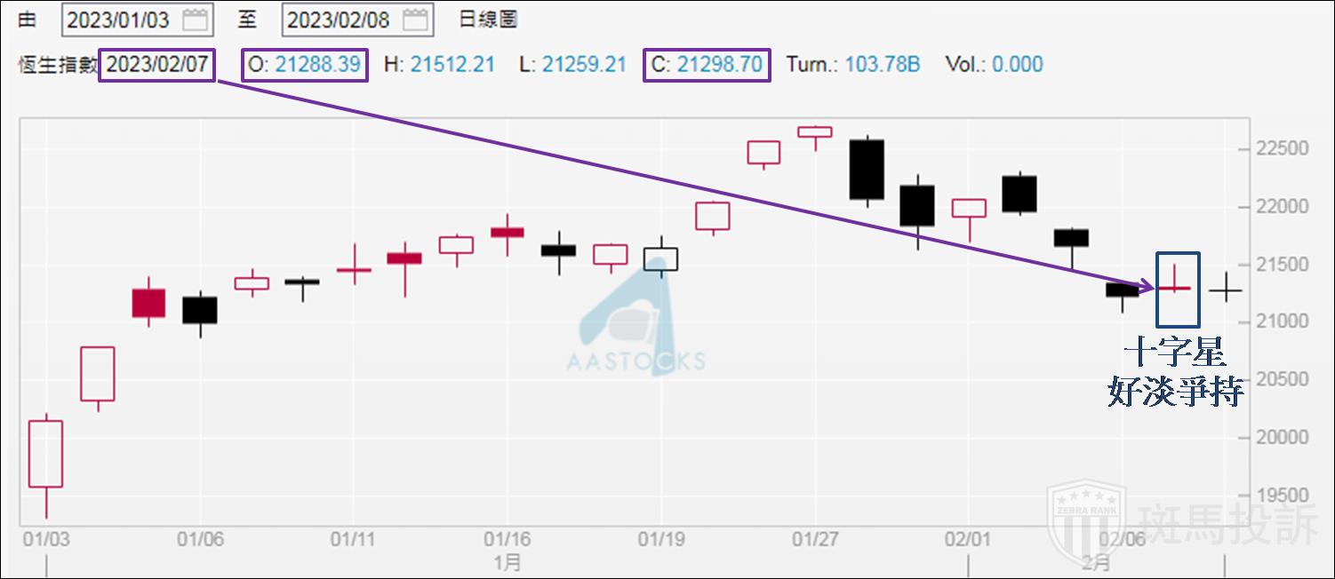 阴阳烛见「十字星」即开市位和收市位相同,或是相当接近,以2月7日开报21,288和21,298点为例,相距仅10点。在股指上常以差距不多于30点为界,视为烛身近乎消失判断为「十字星」出现。此乃好淡争持格局(如下图),于1月30日至2月6日共六个交易日,其中五日见跌,理应卖方动力占优,却于紧接的2月7日见「十字星」,反映卖方不再占优。从卖方动力减弱,配合好淡争持,合理预期是买方动力逐渐夺回优势,推断昨天应出现烛身较长的阳烛。谁知仍见「十字星」,意味着优势还未落入买方手中。