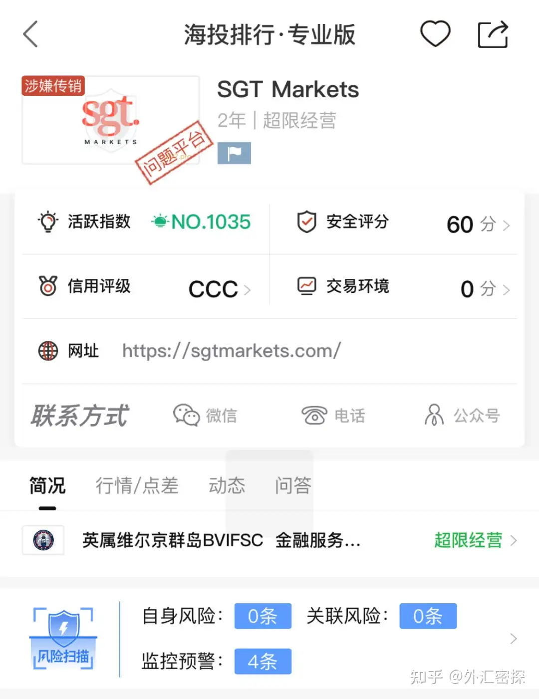 海投排行数据显示,SGT Markets成立于2021年,活跃指数第1035名,安全评分60分,信用评级CCC,官方宣称持有英属维京群岛的外汇牌照,经外汇密探查询,该牌照为证券等金融服务牌照,并非针对外汇交易的牌照,故无法保障外汇投资者的交易和资金安全。
