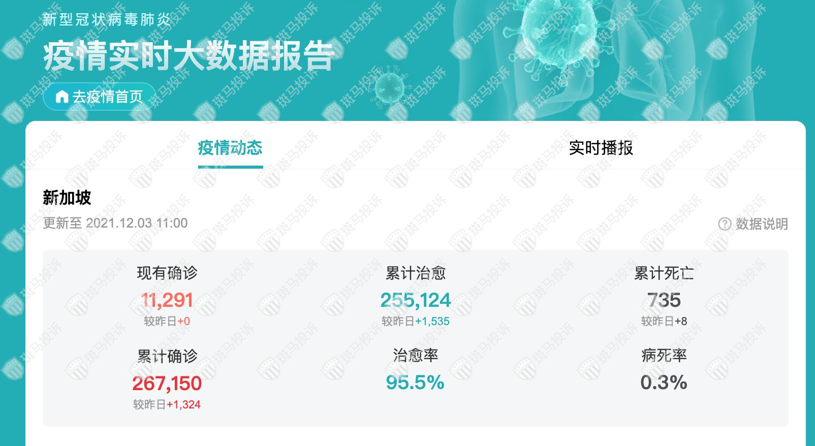 新加坡新冠疫情最新消息:截至2021年12月03日10时,新加坡昨日新增1324例确诊,新增治愈1535例,新增死亡8例,现有确诊11291例,病毒死亡率0.3%。