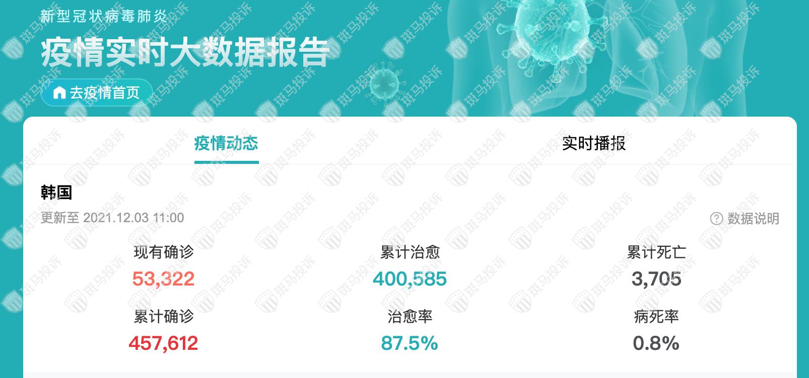 :截至2021年12月03日10时,韩国昨日新增4944例确诊,累计治愈400585例,新增死亡34例,现有确诊53322例,病毒死亡率0.8%。